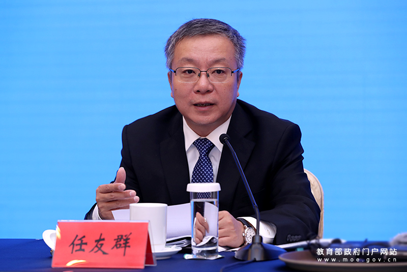 教育部教師工作司司長任友群介紹職業(yè)院?!半p師型”教師隊伍建設總體情況和《深化新時代職業(yè)教育“雙師型”教師隊伍建設改革實施方案》、《關于公布首批全國職業(yè)教育教師企業(yè)實踐基地名單的通知》等文件。(中國教育報記者 張勁松/攝)