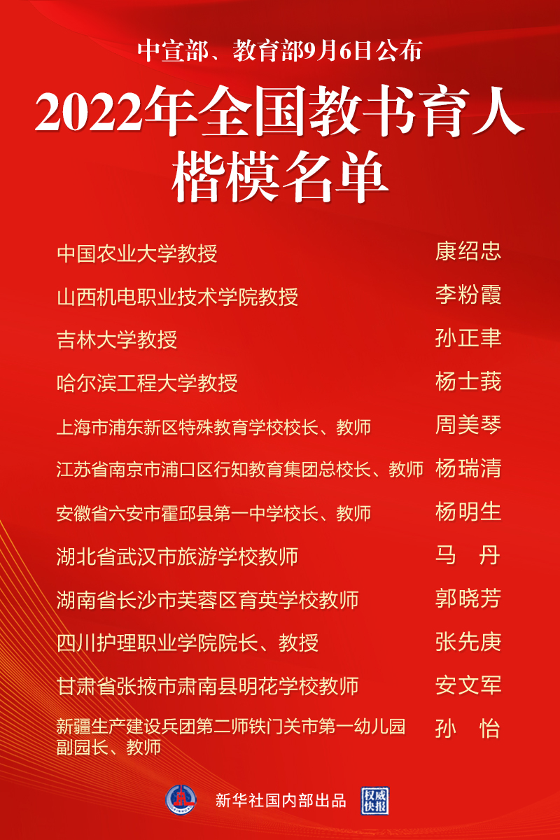 這12位全國教書育人楷模,有的深耕思政課堂、傳播黨的創(chuàng)新理論,有的勇攀科研高峰、取得顯著成果,有的一輩子扎根基層、矢志奉獻(xiàn)山區(qū)教育,有的創(chuàng)新思路方法、為孩子傾注大愛深情,充分展示了新時代教師隊伍有理想信念、有道德情操、有扎實(shí)學(xué)識、有仁愛之心的良好精神風(fēng)貌,是廣大人民教師的優(yōu)秀代表和杰出典范。他們是:中國農(nóng)業(yè)大學(xué)教授康紹忠,山西機(jī)電職業(yè)技術(shù)學(xué)院教授李粉霞,吉林大學(xué)教授孫正聿,哈爾濱工程大學(xué)教授楊士莪,上海市浦東新區(qū)特殊教育學(xué)校校長、教師周美琴,江蘇省南京市浦口區(qū)行知教育集團(tuán)總校長、教師楊瑞清,安徽省六安市霍邱縣第一中學(xué)校長、教師楊明生,湖北省武漢市旅游學(xué)校教師馬丹,湖南省長沙市芙蓉區(qū)育英學(xué)校教師郭曉芳,四川護(hù)理職業(yè)學(xué)院院長、教授張先庚,甘肅省張掖市肅南縣明花學(xué)校教師安文軍,新疆生產(chǎn)建設(shè)兵團(tuán)第二師鐵門關(guān)市第一幼兒園副園長、教師孫怡。