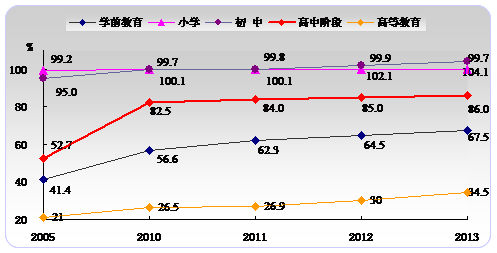 各級(jí)教育普及水平不斷提高,國民受教育機(jī)會(huì)進(jìn)一步擴(kuò)大。2013年,學(xué)前教育毛入園率達(dá)67.5%,比上年提高3個(gè)百分點(diǎn);義務(wù)教育普及水平處于高位,小學(xué)學(xué)齡兒童凈入學(xué)率達(dá)99.71%,初中階段毛入學(xué)率達(dá)104.1%,比上年提高2個(gè)百分點(diǎn);高中階段毛入學(xué)率達(dá)86.0%,比上年提高1個(gè)百分點(diǎn);高等教育毛入學(xué)率達(dá)34.5%,比上年提高4.5個(gè)百分點(diǎn)。