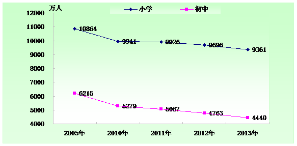義務(wù)教育規(guī)模繼續(xù)減少。2013年,普通小學(xué)為21.4萬所,比上年減少1.5萬所;在校生為9360.5萬人,比上年減少335.3萬人,下降3.5%;全國共有初中階段學(xué)校為5.3萬所,比上年減少412所;初中階段在校生為4440.1萬人,比上年減少322.9萬人,下降6.8%。