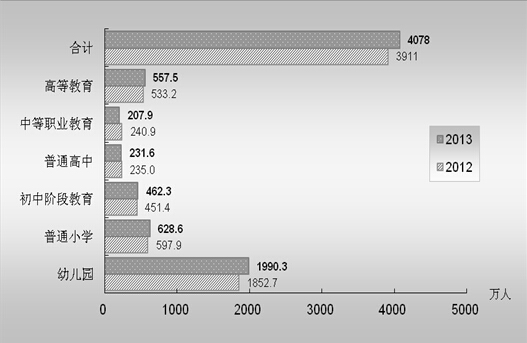 2013年,全國各級(jí)各類教育蓬勃發(fā)展,教育公平進(jìn)一步推進(jìn),入學(xué)機(jī)會(huì)繼續(xù)擴(kuò)大,資源配置更趨合理,教育質(zhì)量逐步提高。學(xué)前教育規(guī)模保持較大幅度增長,毛入園率繼續(xù)上升;義務(wù)教育普及與鞏固水平保持高位;高中階段教育規(guī)模略有減少,比例結(jié)構(gòu)更趨優(yōu)化;高等教育規(guī)模適度增長,重點(diǎn)正轉(zhuǎn)向優(yōu)化結(jié)構(gòu)與提高質(zhì)量。