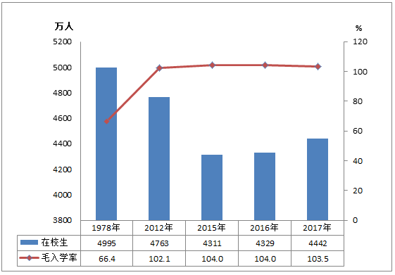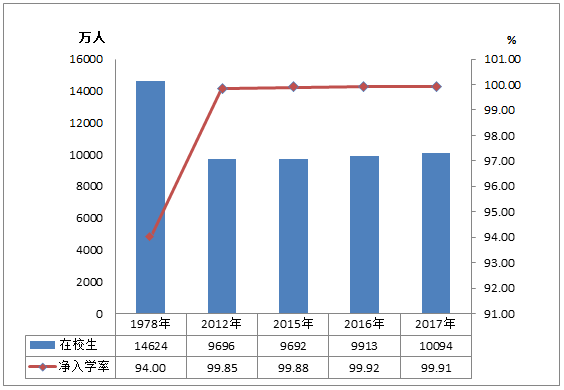 圖2 1978年、2012年、2015-2017年小學在校生和凈入學率