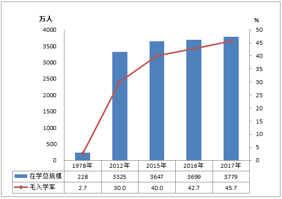 圖5 1978年、2012年、2015-2017年高等教育在學規(guī)模和毛入學率