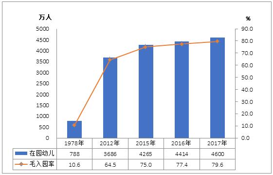 圖1 1978年、2012年、2015-2017年學前教育在園幼兒和毛入園率