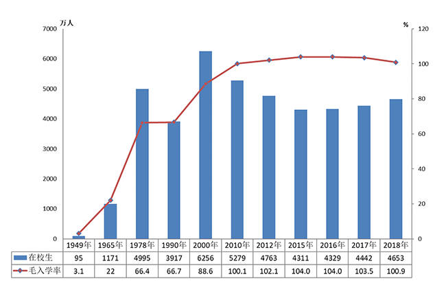 [4]毛入學(xué)率,是指某一級(jí)教育不分年齡的在校學(xué)生總數(shù)占該級(jí)教育國(guó)家規(guī)定年齡組人口數(shù)的百分比。由于包含非正規(guī)年齡組(低齡或超齡)學(xué)生,毛入學(xué)率可能會(huì)超過(guò)100%。