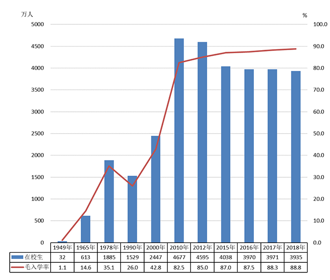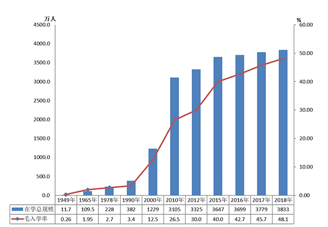 [18]包括研究生、普通本專科、成人本???、網(wǎng)絡(luò)本???、高等教育自學(xué)考試本??频雀鞣N形式的高等教育在學(xué)人數(shù)。