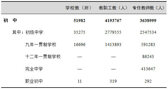 全國(guó)共有初中學(xué)校5.20萬(wàn)所(含職業(yè)初中11所),比上年增加88所,增長(zhǎng)0.17%。招生1602.59萬(wàn)人,比上年增加55.37萬(wàn)人,增長(zhǎng)3.58%;在校生4652.59萬(wàn)人,比上年增加210.52萬(wàn)人,增長(zhǎng)4.74%;畢業(yè)生1367.77萬(wàn)人,比上年減少29.70萬(wàn)人,下降2.13%。初中階段毛入學(xué)率[4]100.9%。