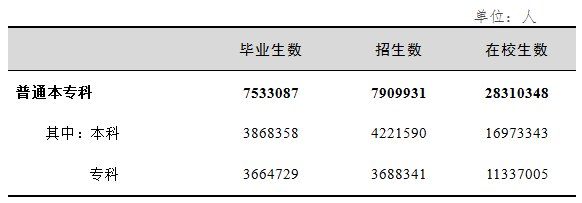 普通本??普猩?90.99萬(wàn)人,比上年增加29.50萬(wàn)人,增長(zhǎng)3.87%;在校生2831.03萬(wàn)人,比上年增加77.45萬(wàn)人,增長(zhǎng)2.81%;畢業(yè)生753.31萬(wàn)人,比上年增加17.48萬(wàn)人,增長(zhǎng)2.38%。