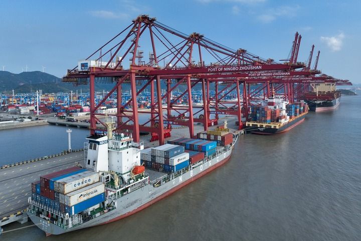 ??2025年10月13日,在寧波舟山港金塘港區(qū)大浦口集裝箱碼頭,船舶進(jìn)行集裝箱裝卸作業(yè)(無人機(jī)照片)。(新華社發(fā) 鄒訓(xùn)永/攝)