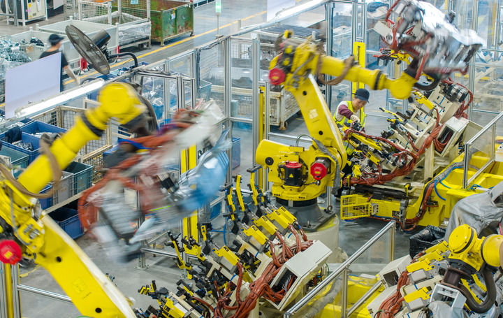 ??2025年10月9日,浙江省湖州市長興經(jīng)濟(jì)技術(shù)開發(fā)區(qū)的長興地通汽車部件有限公司技術(shù)人員操控工業(yè)機(jī)器人生產(chǎn)新能源汽車配件(無人機(jī)照片)。(新華社發(fā) 譚云俸/攝)