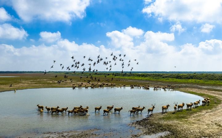 ??2025年10月11日,在江蘇東臺條子泥濕地,候鳥飛翔,成群野生麋鹿悠閑散步,一派人與自然和諧共生的生態(tài)美景(無人機(jī)照片)。(新華社發(fā) 孫家錄/攝)