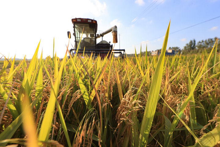 ??2025年10月16日,在江蘇省連云港市贛榆區(qū)城頭鎮(zhèn)中青墩村,種植戶駕駛收割機(jī)搶收水稻。(新華社發(fā) 司偉/攝)