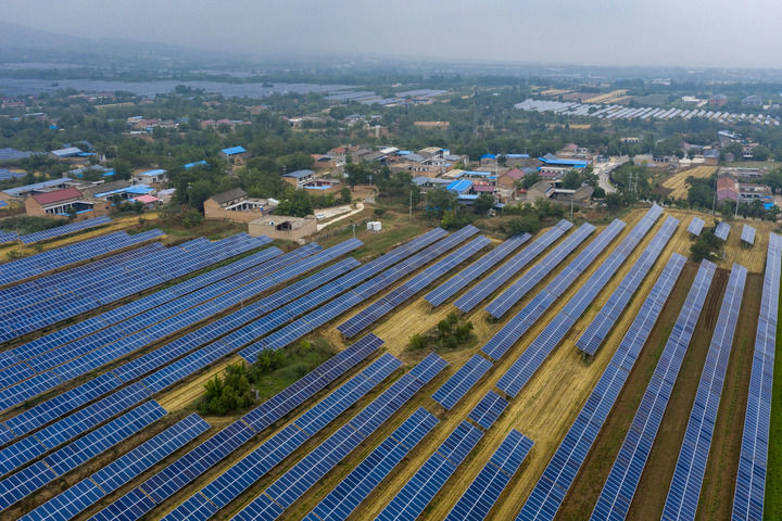 ??2025年6月25日在山西省運城市芮城縣夭上村拍攝的光伏基地(無人機(jī)照片)。(新華社記者 楊晨光/攝)