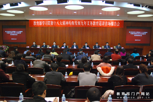 袁貴仁指出,黨的十八大報告將教育放在改善民生和加強社會建設之首,明確提出了均衡發(fā)展九年義務教育,合理配置教育資源,大力促進教育公平等下一階段教育事業(yè)科學發(fā)展的戰(zhàn)略性目標和任務。教育戰(zhàn)線當前和今后一個時期的首要政治任務,就是緊密結合實際,認真學習宣傳、全面貫徹落實黨的十八大精神。組織均衡發(fā)展義務教育巡講團,宣傳推廣典型經驗,是學習宣傳貫徹落實黨的十八大精神的具體舉措,對于把教育系統學習宣傳貫徹黨的十八大精神不斷引向深入、進一步推進義務教育均衡發(fā)展具有示范帶動意義。