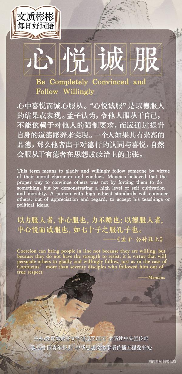 This term means to gladly and willingly follow someone by virtue of their moral character and conduct. Mencius believed that the proper way to convince others was not by forcing them to do something, but by demonstrating a high level of self-cultivation and morality. A person with high ethical standards will convince others, out of appreciation and regard, to accept his teachings or political ideas.