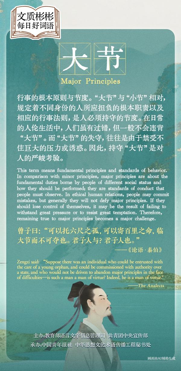 This term means fundamental principles and standards of behavior. In comparison with minor principles, major principles are about the fundamental duties borne by people of different social status and how they should be performed; they are standards of conduct that people must observe. In ethical human relations, people may commit mistakes, but generally they will not defy major principles. If they should lose control of themselves, it may be the result of failing to withstand great pressure or to resist great temptation. Therefore, remaining true to major principles becomes a major challenge.