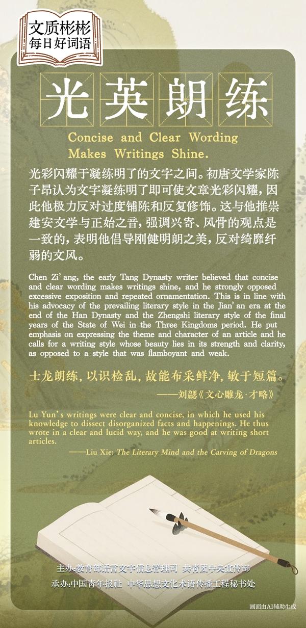 光彩閃耀于凝練明了的文字之間。初唐文學家陳子昂認為文字凝練明了即可使文章光彩閃耀,因此他極力反對過度鋪陳和反復修飾。這與他推崇建安文學與正始之音,強調興寄、風骨的觀點是一致的,表明他倡導剛健明朗之美,反對綺靡纖弱的文風。