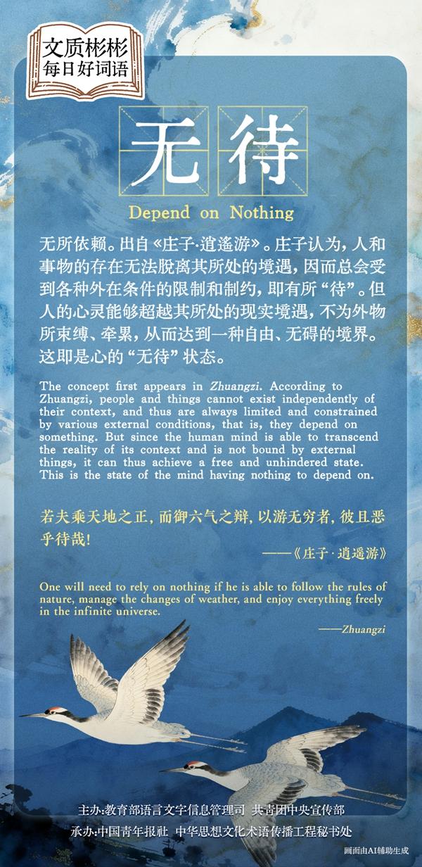 無所依賴。出自《莊子·逍遙游》。莊子認(rèn)為,人和事物的存在無法脫離其所處的境遇,因而總會(huì)受到各種外在條件的限制和制約,即有所“待”。但人的心靈能夠超越其所處的現(xiàn)實(shí)境遇,不為外物所束縛、牽累,從而達(dá)到一種自由、無礙的境界。這即是心的“無待”狀態(tài)。