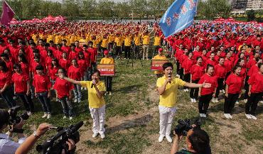 5月31日,兩名大學(xué)生志愿者領(lǐng)唱第九屆全國(guó)大運(yùn)會(huì)會(huì)歌《擁抱未來(lái)》。