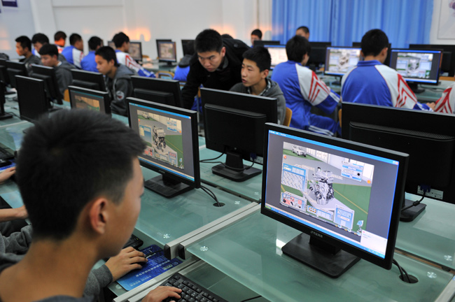 11月14日,在沈陽的遼寧省汽車工程學校,學生利用信息化教學系統(tǒng)進行虛擬汽車實訓。(新華社記者 孫瑞博攝)