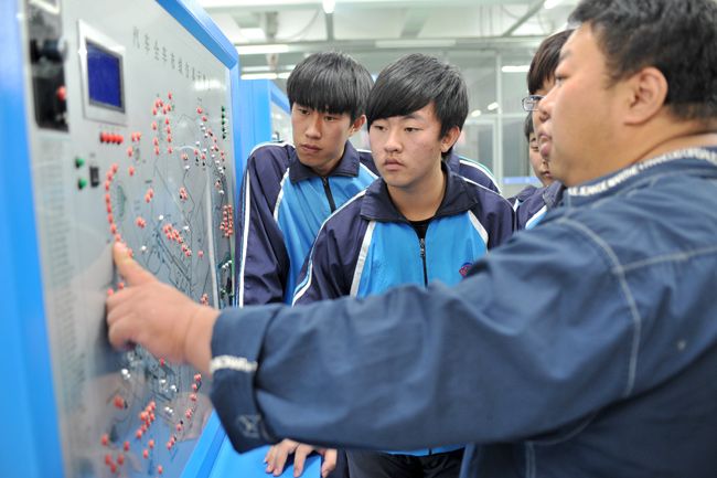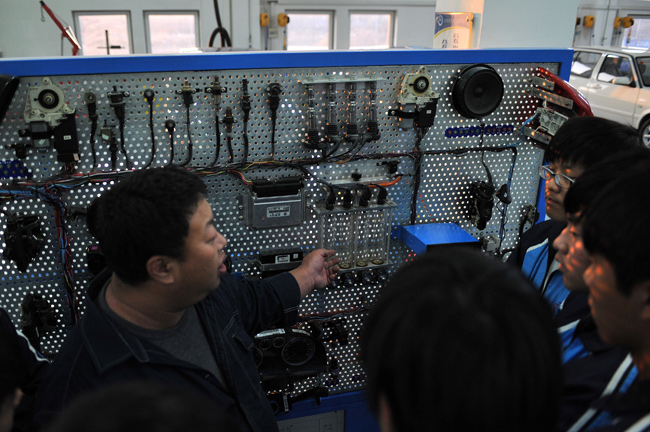 11月14日,在沈陽的遼寧省汽車工程學校,教師給學生講解汽車相關(guān)結(jié)構(gòu)知識。(新華社記者 孫瑞博攝)