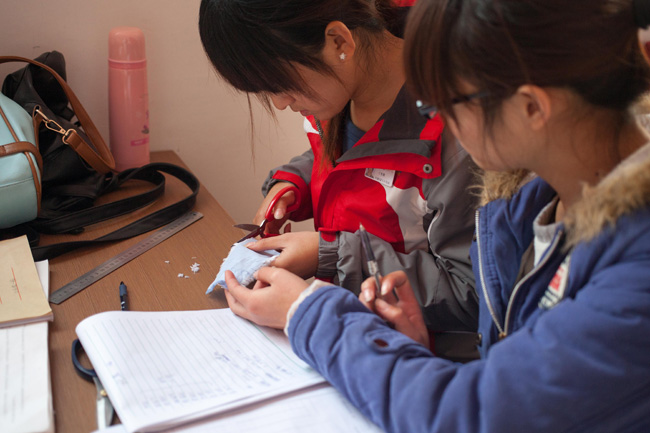 11月22日,在山東科技職業(yè)學(xué)院,紡織服裝系學(xué)生測(cè)量織物小樣織縮率。(新華社記者 白雪騏攝)