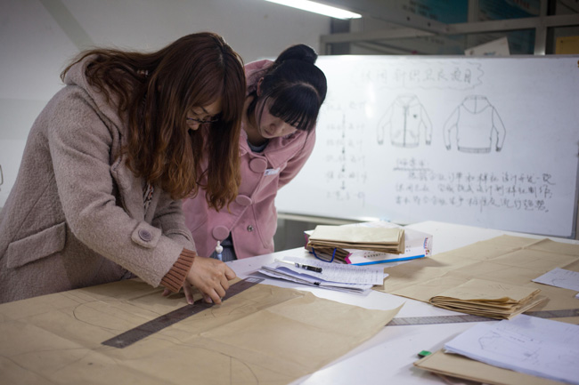 11月22日,在山東科技職業(yè)學(xué)院,紡織服裝系學(xué)生實(shí)習(xí)服裝打版操作。(新華社記者 白雪騏攝)