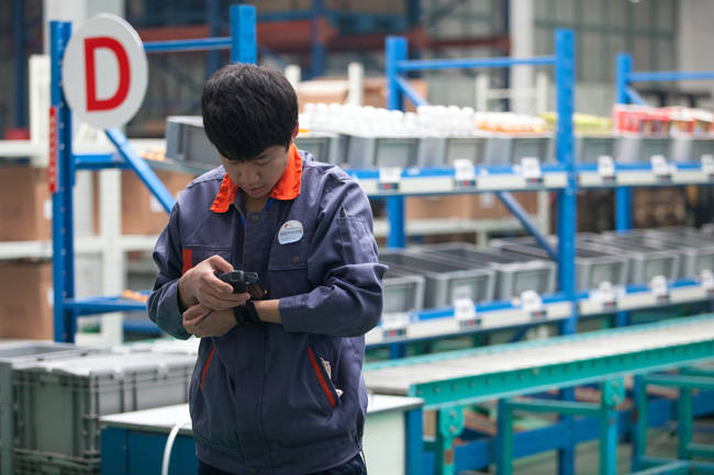 11月22日,在山東省濰坊商業(yè)學(xué)校,一名學(xué)生通過手持終端查看物流信息。(新華社記者 白雪騏攝)
