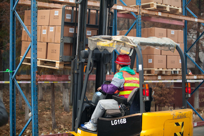 11月22日,在山東省濰坊商業(yè)學(xué)校,一名學(xué)生展示叉車操作技能。(新華社記者 白雪騏攝)