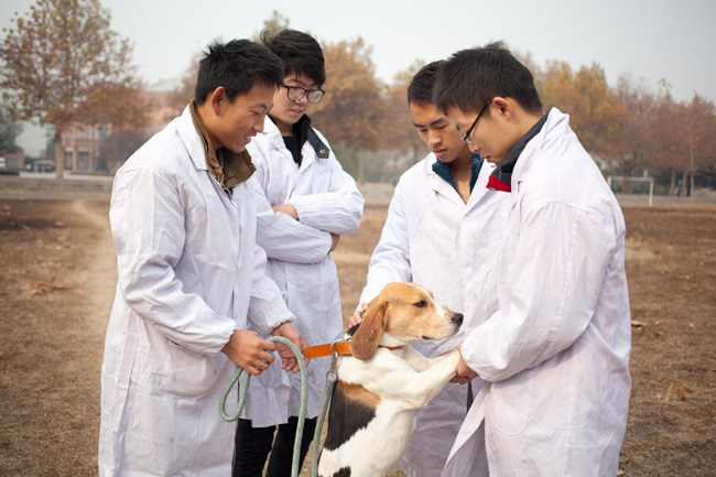 11月23日,在山東畜牧獸醫(yī)職業(yè)學院,寵物系學生對比格犬進行訓導。(新華社記者 白雪騏攝)
