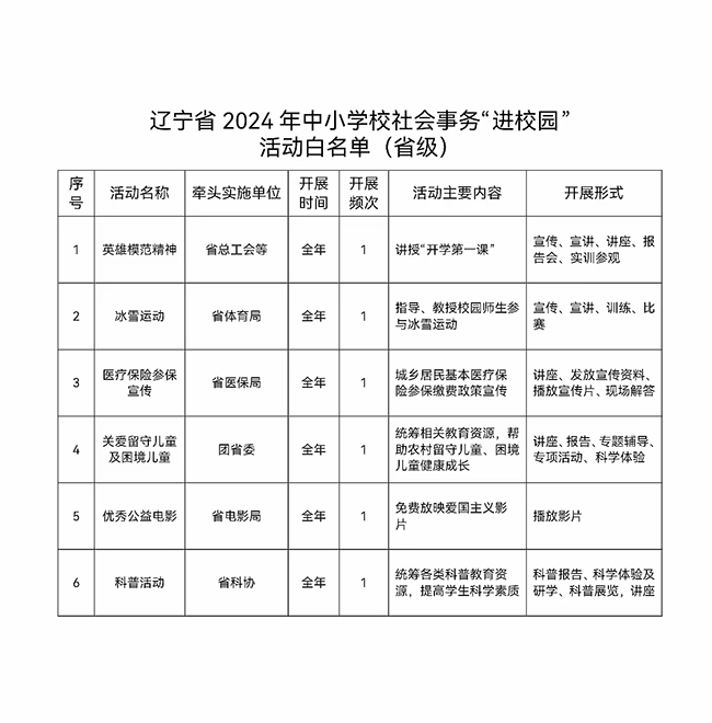 為持續(xù)推進(jìn)整治形式主義為基層減負(fù),按照中央教育工作領(lǐng)導(dǎo)小組秘書(shū)組關(guān)于開(kāi)展規(guī)范社會(huì)事務(wù)進(jìn)校園為中小學(xué)教師減負(fù)專項(xiàng)整治工作的部署要求,在廣泛征求意見(jiàn)建議、充分研究論證基礎(chǔ)上,省委教育工作領(lǐng)導(dǎo)小組秘書(shū)組制定了《遼寧省2024年中小學(xué)校社會(huì)事務(wù)“進(jìn)校園”活動(dòng)白名單(省級(jí))》,現(xiàn)予以公布。