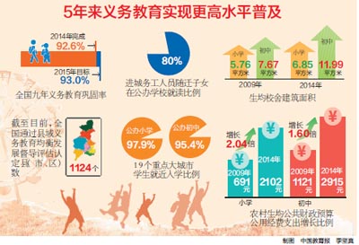 鞏固率是義務教育普及水平的一個重要指標。根據(jù)評估報告提供的數(shù)據(jù),2010年到2014年,全國九年義務教育鞏固率從87.5%逐年上升到92.6%,距教育規(guī)劃綱要提出的2015年達到93%的目標僅一步之遙。