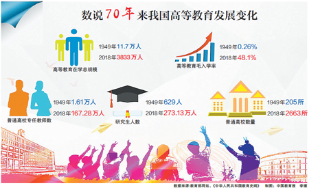 70年風(fēng)雨兼程。從全部在校生不足12萬人到規(guī)模世界第一;從學(xué)蘇聯(lián)、學(xué)歐美到扎根中國大地;從擴招提質(zhì)到全面內(nèi)涵發(fā)展,我國高等教育走出了一條具有中國特色的現(xiàn)代化道路。
