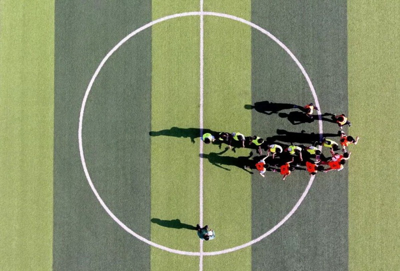 2019年4月17日,太行山深處,初中組男子足球隊隊員在分組對抗賽開始前互相擊掌。(新華社記者 詹彥/攝)