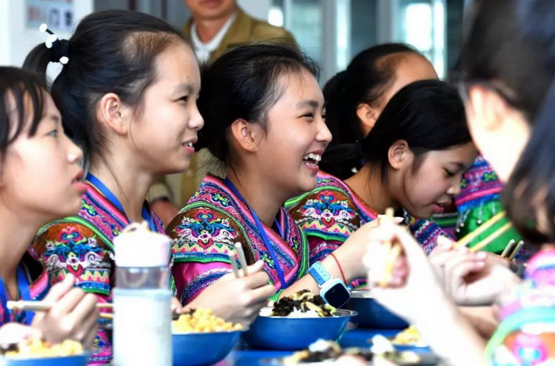 2017年11月1日,廣西融水苗族自治縣民族中學的學生們在吃營養(yǎng)餐。該縣共有5.6萬名學生享受免費營養(yǎng)餐。(新華社記者 黃孝邦/攝)