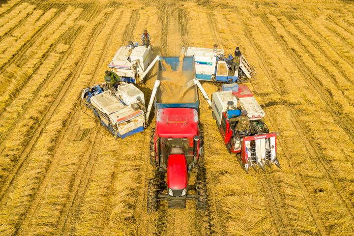 2024年10月13日,在黑龍江省綏化市北林區(qū)雙河鎮(zhèn)稻香村,村民駕駛農(nóng)機(jī)進(jìn)行卸糧作業(yè)(無人機(jī)照片)。(新華社記者 張濤/攝)