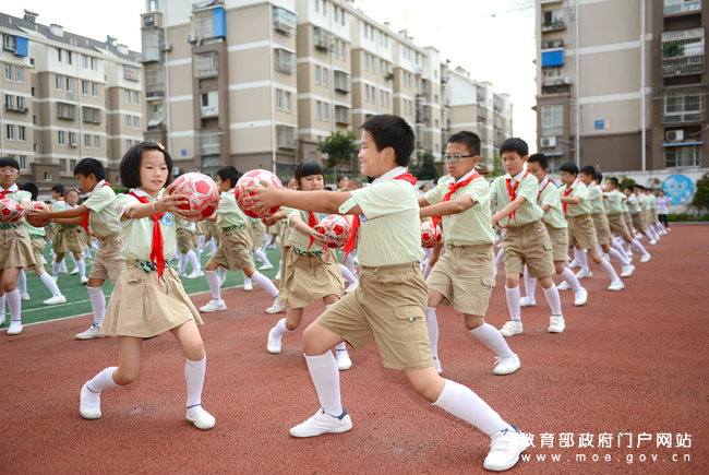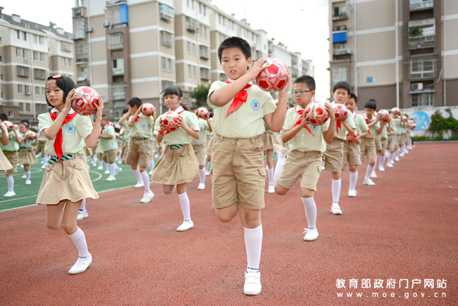 南京市秦淮第二實驗小學為同學們設計的以足球和健身為主題的“足球韻律操”,成為該校大課間活動的一個特色。(張玨瑛攝)