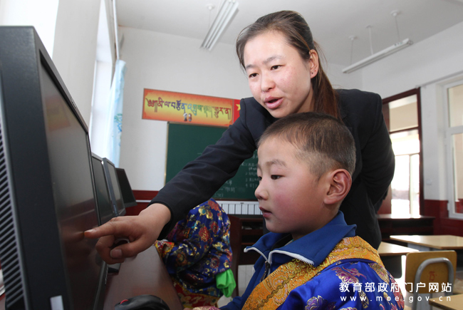 縣級(jí)優(yōu)秀教師王萬環(huán)在電教室通過電腦教學(xué)生打字和畫畫,在僅有的四名老師中,她是這里唯一的女教師。(張勁松/攝 任巍/文)