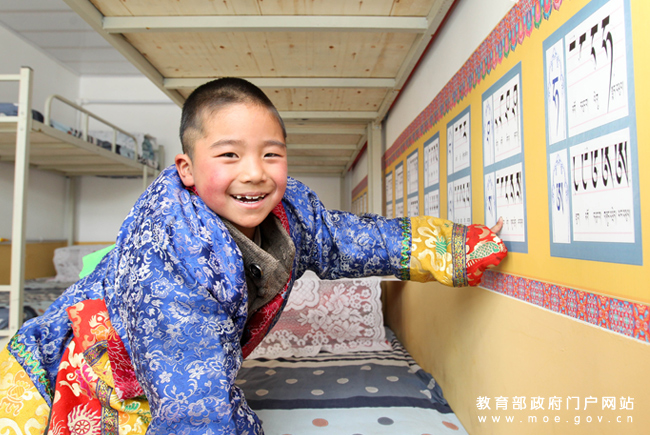 在天??h抓喜秀龍鄉(xiāng)代乾教學(xué)點(diǎn)新建成的學(xué)生宿舍內(nèi),10歲的三年級(jí)學(xué)生陳積虎展示藏文教育標(biāo)語。(張勁松/攝 任巍/文)