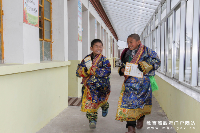 10歲的三年級(jí)學(xué)生陳積虎(右)與同學(xué)李軍文歡快的去上課。(張勁松/攝 任巍/文)