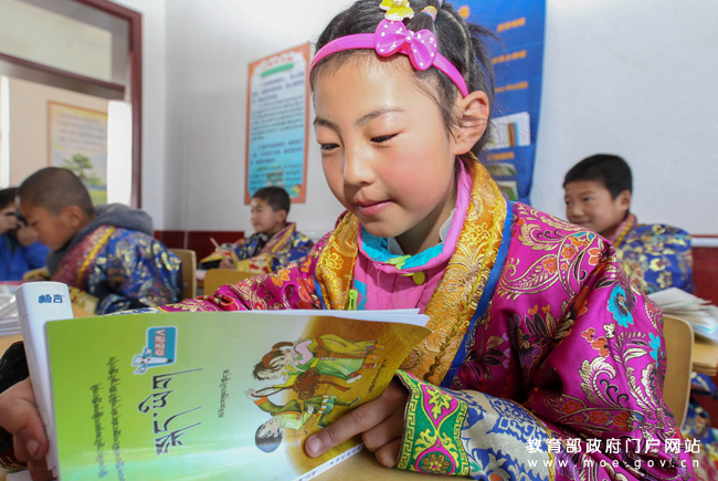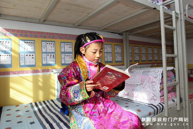 下課了,11歲的三年級(jí)學(xué)生安抓喜東智在安有暖氣的宿舍看書。(張勁松/攝 任巍/文)