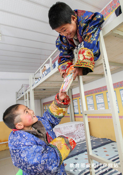 10歲的三年級(jí)學(xué)生陳積虎(下)與上鋪的同學(xué)李軍遞交課本。(張勁松/攝 任巍/文)