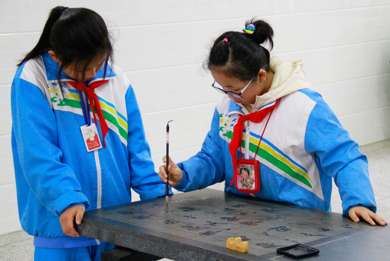 學生正在認真練習書法。新建區(qū)第七小學致力教育師生感恩國家,感恩社會。