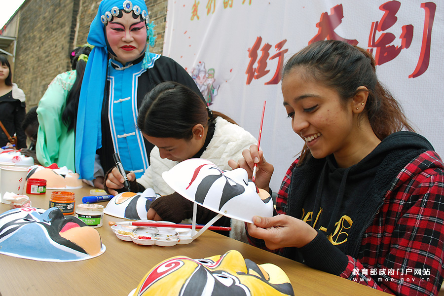 近日,江蘇大學(xué)來自贊比亞、韓國、印度等國的留學(xué)生走進(jìn)鎮(zhèn)江市金山街道楊家門社區(qū)街巷劇場,在當(dāng)?shù)貞蚯庇阎笇?dǎo)下畫戲曲臉譜,學(xué)習(xí)戲曲唱腔及其表演藝術(shù),體驗(yàn)中國傳統(tǒng)的戲曲文化。(石玉成 平娜/攝)