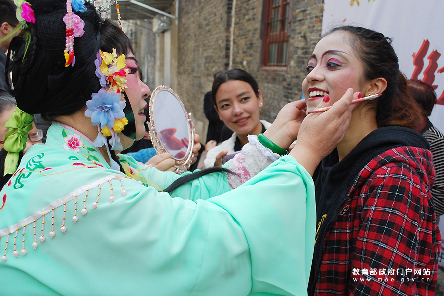 戲曲票友在為江蘇大學(xué)的外國留學(xué)生化妝。(石玉成 平娜/攝)