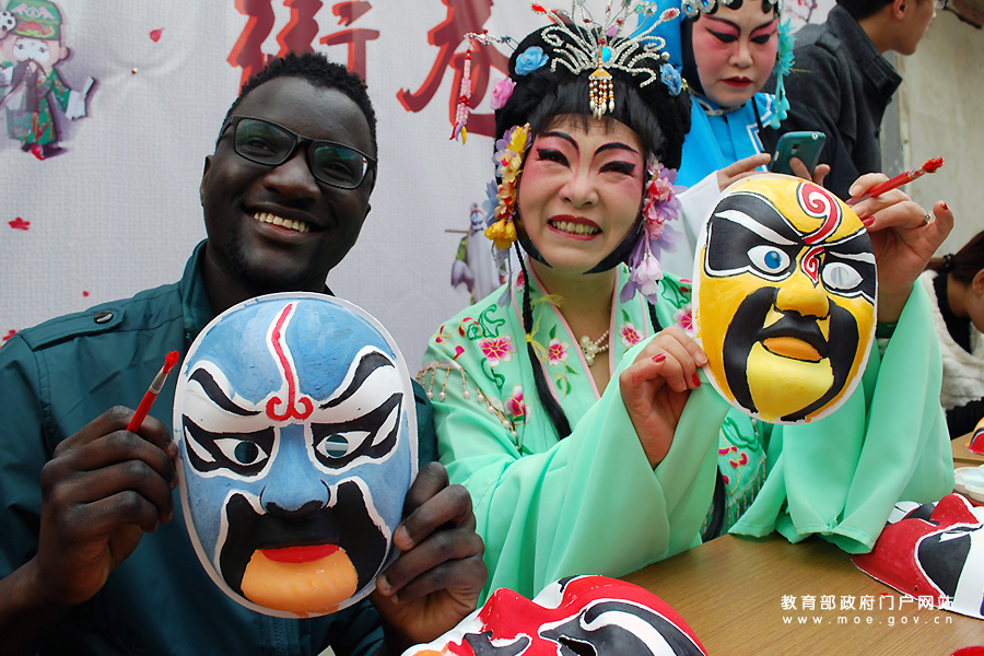 來自贊比亞的留學(xué)生Zulu和戲曲票友在展示畫好的臉譜。(石玉成 平娜/攝)