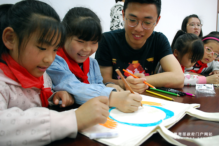 1/0志愿者在指導(dǎo)小朋友涂鴉環(huán)保布袋。(石玉成 張冬冬/攝)