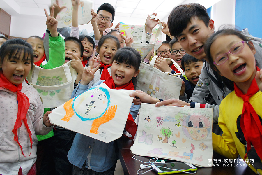 1/0小朋友和志愿者在展示涂鴉了環(huán)保畫(huà)的環(huán)保布袋。(石玉成 張冬冬/攝)