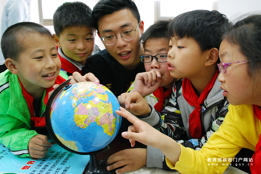 1/0志愿者通過(guò)地球儀為小朋友講解環(huán)保知識(shí)。(石玉成 張冬冬/攝)