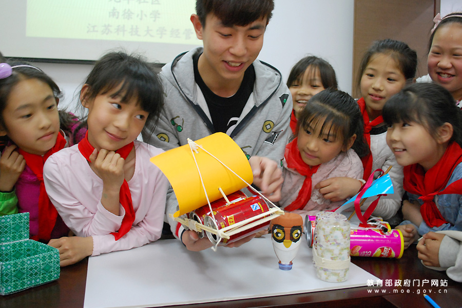 1/0在4月22日“世界地球日”來(lái)臨之際,江蘇科技大學(xué)志愿者來(lái)到鎮(zhèn)江市七里甸街道光華社區(qū),指導(dǎo)小朋友涂鴉環(huán)保布袋,用廢舊材料制作環(huán)保工藝品,通過(guò)地球儀為孩子們講解地球與環(huán)境等環(huán)保知識(shí),表達(dá)呵護(hù)地球從我做起的決心。(石玉成 張冬冬/攝)
